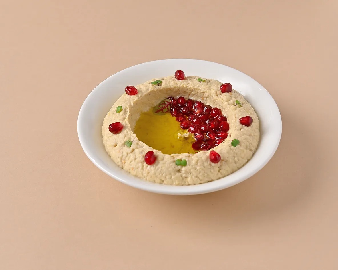 A puree of grilled eggplant, lemon juice & tahina paste.